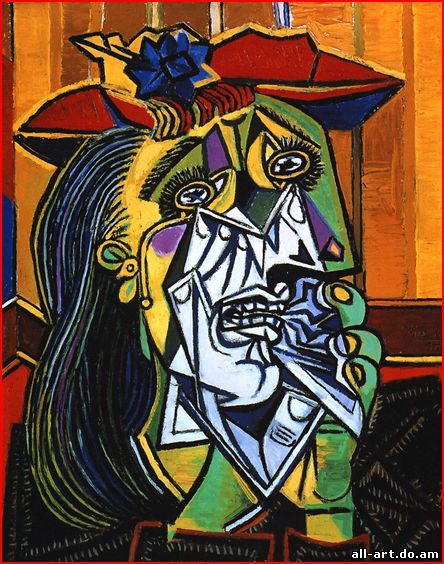 Пикассо Пабло. Плачущая женщина В резких цветовых сочетаниях, в жестких изломах линий запечатлелась мучительная боль, исказившая лицо охваченной страданием женщины. Взгляд зрителя фокусируется на блеклой синеве вокруг рта и зубов; формы глаз и лба расколоты - буквально сломлены горем. Этот образ перекликается с персонажами монументального панно Герника, написанного в том же году и изображающего гибель женщин и детей во время гражданской войны в Испании. Данная картина является одной из наиболее выразительных в серии Плачущих женщин. Раздробленные, сдвинутые объемы лица - прием, восходящий к кубизму, направлению, основанному Пикассо и Браком. На протяжении своей долгой, сопровождавшейся шумным успехом творческой деятельности Пикассо создал огромный корпус работ. Будучи испанцем по происхождению, он приехал в Париж в 1901 году и оставался во Франции до конца жизни. Пикассо признан величайшим художником XX века.