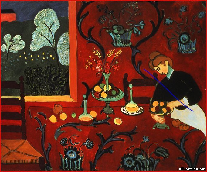 Матисс Анри. Красная комната (Десерт. Гармония в красном) Шквал основных цветов обрушивается на зрителя в этой ослепительно великолепной картине, которая изображает интерьер комнаты с женщиной, накрывающей на стол. Живописная поверхность холста приведена к единой гармонии вибрацией чистого цвета, мастерски вписанного в композиционную структуру и заполняющего собой все пространство комнаты. Скатерть сливается со стеной, предметы кажутся совершенно плоскими, художник упрощает и искривляет их форму. Это усиливает впечатление лирического наплыва орнаментальных форм и переливающихся радугой красок. Цвет для Матисса - не столько средство изображения, сколько средство выражения, он сознательно пренебрегает традиционными правилами рисунка и перспективы. Он и его последователи получили прозвище фовистов, или диких, благодаря первозданной дикости их стиля. Фовистская манера Матисса охватывает 1905-1908 годы, стиль художника продолжал развиваться на протяжении всей его долгой творческой жизни. Цвет всегда играл в работах Матисса, какими бы они ни были, главную роль. Это очевидно и в великолепных коллажах, которые он делал в поздний период.
