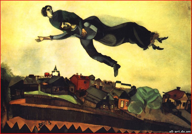 Шагал Марк. Над городом Над городом, состоящим из простых деревянных домов и сараев, летят по небу две фантастические фигуры. Мужчина рукой нежно обнимает женщину за грудь. Кажется, это любовники, которые, может быть, совершают тайный побег. Странный и наивно упорядоченный город, изображенный посредством цветовых пятен, с его чудными деревянными заборами и теплыми красками, обнаруживает интерес Шагала к сказкам и фантастическому. Шагал родился в России, и многие его образы крепко укоренены в мире еврейского фольклора ранней поры его жизни. Его стиль сложен и вместе с тем по-детски прост, в его красочных композициях смешиваются реальность и сон. Шагал был вынужден покинуть Россию, поскольку государству требовалось искусство определенного типа; после отъезда он делил свое время между США и Францией. Он был очень плодовитым художником и занимался живописью, мозаиками, театральными декорациями и гобеленами. Его произведения можно встретить во многих общественных зданиях, в том числе в парижской Гранд-Опера и в здании Штабквартиры ООН в Нью-Йорке.