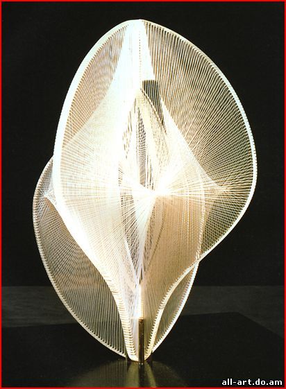 Нейлоновая струна намотана вокруг двух пересекающихся листов изогнутого плексигласа для создания сложной трехмерной модели из вогнутых и выпуклых складок. Эти части, перетекая друг в друга, создают иллюзию ее бесконечного вращения вокруг своей оси, парение в абсолютном пространстве, где время замерло. Произведение было задумано как часть трехметровой, так и не осуществленной конструкции, заказанной Габо в 1949 голу для здания Эссо в Нью-Йорке. Габо принадлежал к движению конструктивизма и воспринимал форму как метафору пространства. В 1922 году он покинул родную Россию, жил в Берлине и Париже, а впоследствии стал гражданином США. В 1952 году он создал огромную скульптурную композицию для торгового центра в Роттердаме, где проявился также его архитектурный талант.