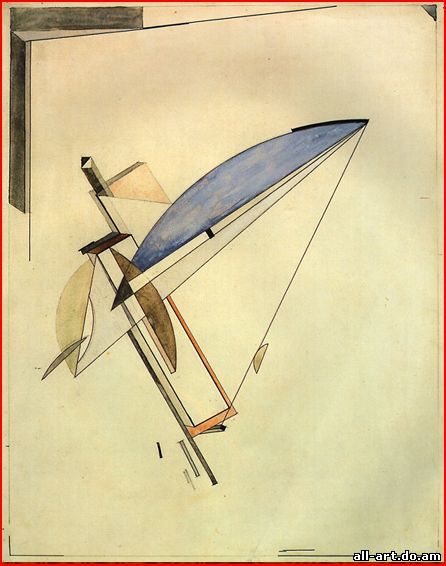 Вращающиеся геометрические объекты, написанные нежными цветами, словно плавают в воздухе, создавая этим ощущение глубины и иллюзию пространства. Некоторые из форм даны в трех измерениях, и этот намек на архитектурные объемы развит в более поздних произведениях Лисицкого. В этой работе в концентрации чистой формы и цвета проявляется влияние того направления абстрактного искусства, которое изобрел Казимир Малевич, - супрематизма, базирующегося на чистых геометрических фигурах. Лисицкий получил инженерное и архитектурное образование. Марк Шагал пригласил его преподавать архитектуру и графику в художественную школу в Витебске; здесь он попал под влияние Малевича. Хорошо известны серии "Проунов" Лисицкого - циклы абстрактных работ, созданных прямыми линиями. Эти работы отличаются эффектными качествами и всеобъемлющей плоскостностью, без единого намека на глубину. Творчество Лисицкого было многосторонним: он занимался также плакатом, дизайном костюма, оформлением выставок и книг.