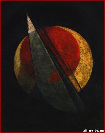 Треугольные формы, балансирующие на фоне окружностей, создают трехмерную иллюзию. которую усиливает затенение левой диагонали треугольников. Плоские формы отделены друг от друга цветом. Состоящая из строго геометрических конструкций, начертанных с помощью циркуля и линейки, картина отражает стремление художника создавать элементарные формы чистыми первичными цветами. В том же году, что и это произведение, Родченко выставил свою знаменитую работу Черное на черном - ответ на серию Малевича Белое на белом. Желание Родченко свести живопись к ее абстрактным, геометрическим сущностям вовлекло его в движение конструктивистов. Позднее вместе с другими членами группы он оставил станковую живопись ради дизайна и прикладных искусств. Особенно активно он работал в области индустриального дизайна, оформления книг и фотографии, часто используя в последней необычные перспективы и углы зрения.