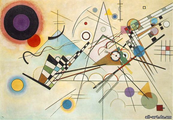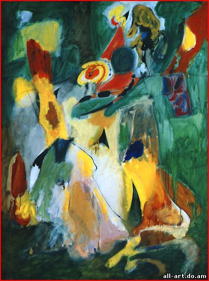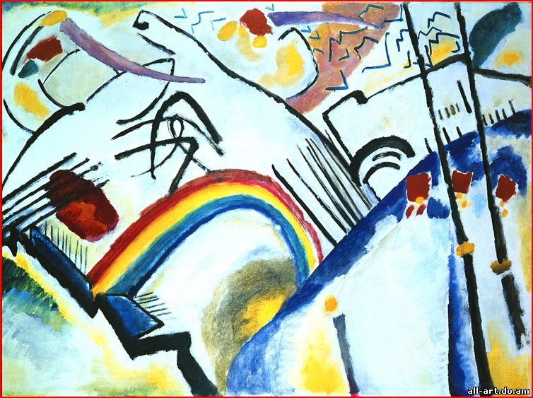 В этой полуабстрактной, необъяснимо притягательной композиции очертания холмов и фигуры казаков с саблями включаются в движение отвлеченных форм, линий и цветовых пятен. Есть особая красота в простоте ее построения и удивительная раскованность в манере наложения мазка. Кандинский считал, что подлинный художник стремится к выражению исключительно внутреннего, сущностного видения. Получив первоначально юридическое образование, Кандинский вскоре осознал, что его настоящее призвание - искусство, и стал одним из выдающихся первооткрывателей "чистой" абстрактной живописи. После длительного пребывания в Мюнхене он вернулся в Россию, где в 1914-1922 годах занимался педагогической деятельностью, основал Российскую академию художественных наук. Влияние русской культуры сказалось в его обращениях к иконописи, к мотивам народного творчества. Некоторое время он преподавал в Баухаузе, прославленной школе современного дизайна. Кандинский осознал значение абстрактного искусства, когда обнаружил в нем "необычайную красоту, излучающую внутренний свет", еще не поняв, что то был свет его собственного творчества, увиденного изнутри, в обратной перспективе. В.Кандинский создал собственный тип абстрактной живописи, освобождая от всяких признаков предметности пятна импрессионистов и "диких”.