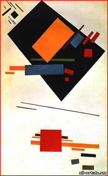 Геометрические элементы, написанные основными цветами, как будто плавают, подвешенные на холсте. Малевич создал сложную композицию из перекрывающих друг друга форм, чтобы передать ощущение глубины и перспективы. Супрематическая работа изгоняет всякий след предмета, опираясь исключительно на взаимодействие формы и цвета. Малевич был основателем супрематизма - системы, которая стремилась достичь абсолютной чистоты этих двух начал. Для Малевича супрематизм означал воплощение чистого художественного чувства, того, что он называл "чувством беспредметного". В 1918 году он довел развитие нефигуративного искусства до логического вывода в серии композиций "Белое на белом", состоящих из белых геометрических форм на белом фоне - своего рода абстракция абстракций. Осознав, что дальше развивать концепцию некуда, Малевич вернулся к фигуративной живописи.