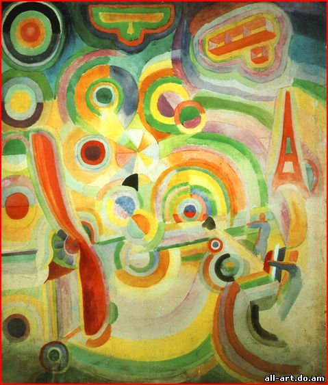 В этой композиции, которая на первый взгляд кажется абстрактной, закрученные спирали и вращающиеся цветовые диски образуют некий лирический узор на поверхности листа бумаги. При более пристальном рассмотрении мы замечаем Эйфелеву башню справа, а также крылья и пропеллер аэроплана слева. Эти элементы, в сочетании с плывущими по небу формами, призваны прославить первый перелет через Ла-Манш, предпринятый Луи Блерио в 1909 году. Художники часто прибегали к бумаге, чтобы набросать свои идеи и разработать композицию. Эта акварель является предварительным эскизом большою коллажа того же названия, который находится в Художественном музее в Базеле. Делоне использовал цвет для создания чисто абстрактных картин: формы и образы в них порождались воображением и не имели никакого отношения к видимому миру. Этот стиль живописи, тесно связанный с музыкой, был назван орфизмом - термин, придуманный поэтом Гийомом Аполлинером.