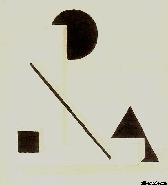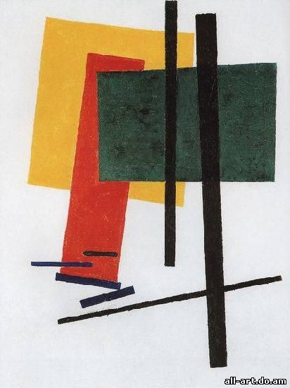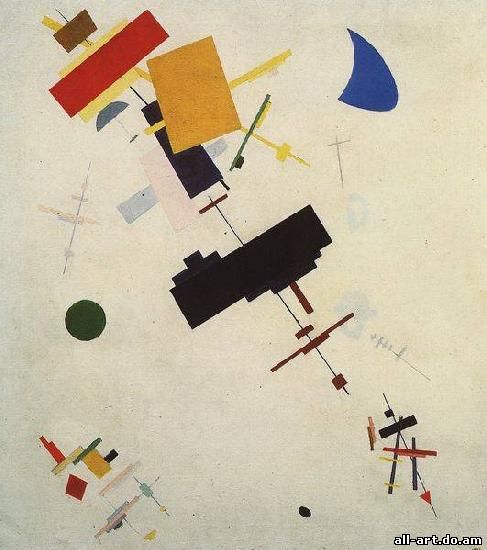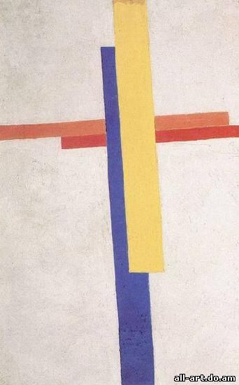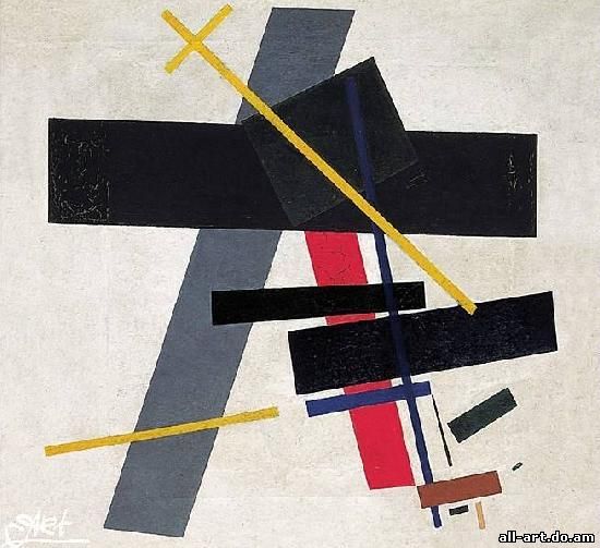 К. С. Малевич. Супрематизм. 1915. Холст, масло, 60x70 см. Музей Людвига, Кёльн. Супрематизм, стиль положенный К. С. Малевичем в основу своих художественных экспериментов 1910-х гг., К. С. Малевич считал его высшей точкой развития искусства (отсюда название, производное от лат. supremus, "высший, последний"), которому свойственны геометрические абстракции из простейших фигур (квадрат, прямоугольник, круг, треугольник). Оказал большое влияние на конструктивизм, производственное искусство. Именно за этими и подобными им геометрическими абстракциями и закрепилось название супрематизм, хотя сам Малевич относил к нему и многие свои работы 20-х гг., внешне содержавшие некоторые формы конкретных предметов, особенно — фигуры людей, но сохранявшие "супрематический дух". Да и собственно более поздние теоретические разработки Малевича не дают оснований сводить супрематизм (во всяком случае самого Малевича) только к геометрическим абстракциям, хотя они, конечно, составляют его ядро, сущность и даже (черно-белый и бело-белый супрематизм) подводят живопись к пределу ее бытия вообще как вида искусства, т. е. к живописному нулю, за которым уже нет собственно живописи. Этот путь во второй половине века и продолжили многочисленные направления в арт-деятельности, отказавшиеся от кистей, красок, холста.