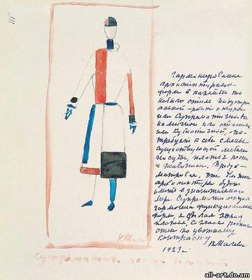 К. С. Малевич. Супрематическое платье. 1923 г. Государственный Русский музей, Санкт-Петербург Ощущение "пустыни небытия", бездны Ничто, метафизической пустоты здесь выражено с не меньшей силой, чем в "Черном" или "Белом" квадратах. И цвет (часто яркий, локальный, праздничный) здесь только усиливает жуткую ирреальность этих образов. Глобальный супрематический апофатизм звучит в «крестьянах» 1928-1932 гг. с предельной силой. В научной литературе стало почти общим местом напомнить фразу из полемики Бенуа и Малевича о "Черном квадрате" как о "голой иконе". "Безликие" крестьяне основателя супрематизма могут претендовать на именование супрематической иконой в не меньшей, если не в большей мере, чем "Черный квадрат", если под иконой понимать выражение сущностных (эйдетических) оснований архетипа. Апофатическая (невыразимая) сущность бытия, вызывающая у человека неверующего ужас перед Бездной небытия и ощущение своей ничтожности перед величием Ничто, а у грядущих экзистенциалистов — страх перед бессмысленностью жизни, выражены здесь с предельным лаконизмом и силой. Человеку же духовно и художественно одаренному эти образы (как и геометрический супрематизм) помогают достичь созерцательного состояния или погрузиться в медитацию. У Малевича было много учеников и последователей в России в 1915-1920 гг., которые объединялись одно время в группе "Супремус", но постепенно все отошли от супрематизма.