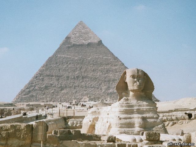 Позднее сооружались огромные погребальные комплексы, куда входили царские усыпальницы - пирамиды, окруженные маленькими пирамидами цариц и гробницами вельмож, и заупокойные храмы (ступенчатая пирамида Джосера, 28 в. до н. э., зодчий Имхотеп; «великие пирамиды» (27-26 вв. до н. э.) фараонов Хуфу (Хеопса; архитектор Хемиун); Хафра (Хефрена) и Менкаура (Микерина) в Гизе (см. ст. Пирамиды египетские). Рядом возвышалось, как грозный страж, изваяние Большого Сфинкса.