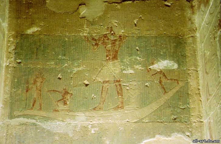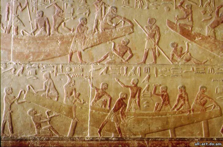 Рельеф гробницы Ти . XXV—XXIV вв. до н.э. Фрагмент. Штукатурка на камне, резец, темпера. Саккара, Египет Рельеф, исполненный в технике барельефа, изображает сцену строительства лодок. Характерный пример — росписи весьма известной гробницы вельможи Ти (сер. III тыс. до н. э.). При чуть более близком рассмотрении «ковер» распадается на огромное количество отдельных эпизодов, сплавленных общим ритмом и пространственными законами — гробница Хнумхотепа. Здесь уже трудно говорить о застылости и тому подобных вещах. Живость и непосредственность в изображениях людей и их занятий выше всякой критики. Возможно эти качества жанровых сцен в сопоставлении с преопределенной фиксированностью и торжественной представительностью парадных портретов можно объяснить разницей в том, какую сакральную функцию выполняли различные изображения: представляли перед богами самого Фараона, или же рассказывали о быте его подданных. В последнем случае важно было живо и реалистично отобразить функции персонажей, что бы они и дальше столь живо служили господину. Мы не должны также удивляться многочисленным изображениям животных в гробницах. Многие животные в Древнем Египте обожествлялись и их изображения являлись изображениями богов. «Гуси». Фреска гробницы зодчего Нефермаата в Медуме. 27 в. до н. э. Каир. Египетский музей. Фрагмент Градация размеров, масштабов фигур внутри одной композиции, дающая декоративную живость и легкую певучую вариативность ритма была для египтян прежде всего градацией ценностей. Главный герой росписей изображался самым большим. Его близкие родственники и приближенные изображались немного меньшими его самого, а второстепенные персонажи изображались меньшими его даже в несколько раз, тому примеры — рельефы в гробнице Ти и в мастаба в Саккара.. Такая шкала была наиболее универсальной табелью о рангах, которой не требовалось отображения особых, различных для каждого чина аксессуаров роскоши и общественного положения. Даже величие власти самого фараона, почитавшегося богом, не обозначалось даже каким-либо дорогими одеждами, почти ничем, кроме исключительной величины его фигуры и эффектной, предопределенной каноном, позой. Нельзя также однозначно утверждать, что какие-то фигуры в росписях или рельефах разработаны тщательнее других. И росписи и рельефы дают картину жизни текущей одинаково размеренно и неотвратимо для всех. Композиция, как правило, построчная, с соблюдением симметрии и уравновешенная. Изображения на рельефах и росписях выполнялись как и в круглой скульптуре соблюдением строгой подчиненности архитектурным формам, с ориентацией на их пропорции и ритмы, на их масштабы.Рельеф гробницы Мерерука . XXIV—XXIII вв. до н.э. Фрагмент. Штукатурка на камне, резец, темпера. Саккара, Египет Мерерука был зятем фараона Тети, первого фараона VI династии (Древнее царство). Гробница Мерерука находится в Саккаре. Одна из крупнейших гробниц некрополя, она содержит свыше тридцати различных помещений, включая погребальные камеры, предназначенные для жены и сына Мерерука. Стены внутренних помещений гробницы украшены рельефами и росписями с изображением сцен повседневной жизни. Рельеф, исполненный в технике барельефа, изображает лодку, плывущую по болоту, кишащему крокодилами и гиппопотамами.Рельеф гробницы Мерерука . XXIV—XXIII вв. до н.э. Ф
