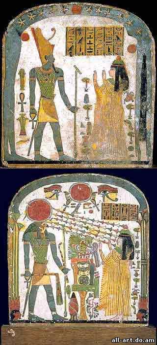 Стела Таперет Приблизительно 900-800 года до н.э. Расписанное дерево. Высота 31 см; ширина 29 см В начале первого тысячелетия до н.э. большие каменные надгробия постепенно сменялись маленькими надгробиями из дерева. На этих деревянных стелах умершего изображали уже не за поминальной трапезой, как раньше, а преклоненным перед могущественными богами потустороннего мира. Со стороны Осириса изображены различные воплощения бога солнца. На одной стороне надгробия умершая знатная женщина Таперет изображена обращающейся с молитвой к Ра-Хорахти (воплощающему полуденное солнце), а на другой - к Атуму (представляющему заходящее солнце). В этих композициях присутствуют два различных символа вселенной. На одной стороне это - небо, протянувшееся в виде арки, сообщающееся с черной полосой - землей через геральдические растения южного и северного Египта. На другой стороне вселенную символизирует богиня неба Нут. По её телу перемещается солнце, которое она каждым вечером глотает и рожает каждое утро. Новшеством на этом ярком надгробии также являются лилии, символизирующие животворящий солнечный свет. Скульптурная группа фараона Осоркона