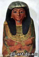Саркофаг торговца Рама. Эрмитаж Художественное ремесло продолжало процветать и в Танисе. Золотые и серебряные царские гробы и великолепные портретные маски, ожерелья, перстни, браслеты с инкрустациями, нагрудные украшения с подвесками в виде цветов лотоса являются свидетельством неослабевавшего мастерства и тонкости вкуса ювелиров. Для скульптуры 10-8 веков также характерно стремление создать внешне нарядный памятник. Особенно отличаются в этом отношении бронзовые статуэтки, начинающие широко распространяться взамен дорогостоящих каменных статуй. Покрытые чеканными узорами и инкрустациями из золота, такие статуэтки достигают иногда высокого качества выполнения. "Супруга Амона" Каромама