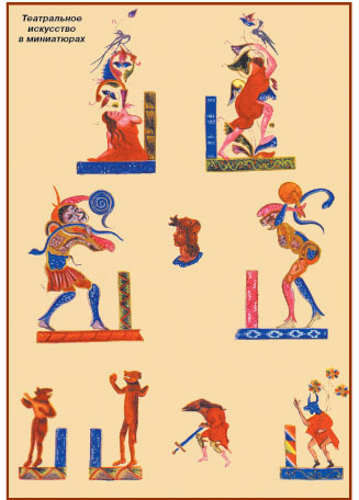 Богатейший материал для изучения театра дают средневековые армянские миниатюры с изображениями актеров и даже целых театральных представлений на различные светские (например, жанровые сценки, на темы притчей, басен, аллегорий и т.п.) и культовые (в частности, из Ветхого и Нового Завета) сюжеты, сцен с ряжеными, дрессированными животными, выступлений музыкантов, танцовщиц ... Алла Тер-Саркисянц, доктор исторических наук