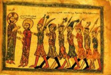 Евангелие 1306 г. Взятие под стражу Принятие христианства в качестве государственной религии было для Армении в первую очередь важным политическим актом. Легенды, письменные источники, немногие находки, прямо относящиеся к начальным годам христианства в Армении, создают картину отнюдь не безоблачную. С начала V века, когда политическая ситуация вызывает в Армении важнейшее в истории народа свершение -- изобретение самостоятельного алфавита и перевод канонических религиозных текстов на армянский язык, -- можно говорить и об искусстве средневековой книги в Армении как о феномене, начавшем самостоятельное существование. С VII века и ведет начало вереница памятников, анализ которых создает картину, весьма разнообразную по проявлениям и вместе с тем поражающую своей цельностью на протяжении более чем тысячелетней истории.