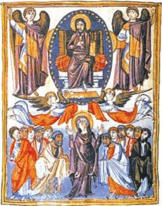 Евангелие царицы Млке 862 г. Вознесение Особый интерес вызывает четвертая сцена -- Поклонение волхвов. Архитектурный фон этой величавой симметричной композиции составляет базилика, в которой развернуты на зрителя оба фронтона. Средняя часть здания занята широкой аркой апсиды с раковиновидной конхой, врезающейся в кровлю до конька. В боковых частях здания из-под декоративных завес видны ряды колонн в обратной перспективе, которые отделяют главный неф от боковых. Богоматерь, сидящая в центре на богато украшенном троне, держит на коленях младенца Христа, изображенного в мандорле (черта, специально отмеченная Н. Кондаковым). Ранний характер концевых миниатюр Эчмиадзинского евангелия, относящихся ко времени сложения христианской иконогарфии, отмечался А. Грабаром. К числу самых ранних датированных рукописей относится уже поминавшееся нами Евангелие царицы Млке, жены васпураканского царя Гагика I. Этот уникальный памятник полностью опубликован. Монументальность, общая темная тональность листов с отдельными сияющими яркостью включениями, заполнение всей картинной плоскости изображениями, а отсюда -- почти полное отсутствие свободного фона, наконец, пастозность красочного слоя, свойственная концевым миниатюрам Эчмиадзинского евангелия, есть и здесь. В Евангелии царицы Млке сохранились шесть хоранов, на двух из которых были расположены в люнетах "нильские сцены", есть изображения четырех евангелистов на фоне драпировок тяжелых цветных завес, причем двое из них стоят, держа евангелие в руках, а двое сидят перед пюпитрами, ножками для которых служат их же стилизованные под мрамор символы -- лев и орел, и, наконец, есть лист со сценой Вознесения. Все миниатюры Евангелия царицы Млке исключительно торжественны, особенно последняя, в которой два апостола-воина, облаченные в плащи и держащие в вытянутых руках копья, как бы охраняют и распахивают небо перед возносящимся Христом. Здесь, как и в других армянских миниатюрах раннего периода, ощущается связь изображения с торжественным церемониалом.