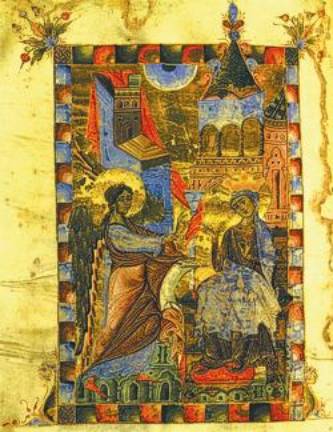 Евангелие 1287 г. Благовещание Нетрудно заметить, что некоторые памятники исполнены мастерами, прошедшими длительную профессиональную выучку, своего рода "академию" в средневековом масштабе. Они воспитывались в монастырях -- центрах образованности, были в курсе проблематики своего времени в широком смысле. Заказчиком подобного мастера был верхний слой общества, книга была не только религиозным текстом, не только произведением современного искусства, но и дорогим изделием. Она выполнялась на прекрасно выделанном пергаменте, краски применялись не только местные, но и привозные, нимбы и фоны по мере необходимости покрывались листовым золотом, переплет часто становился произведением ювелирного искусства. Требования торжественности, представительности не могли в этом случае быть обойдены мастером: он выполнял определенный социальный заказ. У истоков этого направления стоят Евангелие царицы Млке и Эчмиадзинское евангелие, великолепная сохранность которых -- лишнее доказательство равного мастерства всех участников создания этих шедевров, от выделавших пергамент до художников -- авторов миниатюр. Здесь был проявлен, несомненно, высочайший профессиональный уровень, характерный для времени. В другом положении были художники, которые работали вдали от больших культурных центров и богатых монастырей. Они не набивали руку на копировании образцов большого искусства. Отсутствие длительного обучения, отсутствие официального заказа и тем более -- контроля позволяло им действовать более самостоятельно. Именно мастер такого плана вносил в свои работы черты и приемы народного искусства: нормативы средневековых канонов не были для него незыблемыми, и он свободнее отдавался своей фантазии, трактуя события Священного писания как знакомую историю, увлекаясь изображением переживаний действующих лиц и бытовых подробностей события. В фокусе этого течения можно поместить удивительную по выразительности, красоте колорита и экспрессивной краткости рисунка рукопись 1038 года, поддержанную и в свое время, и позже обширным кругом памятников. Близость Киликии к Византии, постоянные контакты с Европой позволяют увидеть в отмеченных чертах результат взаимодействия с духовными центрами христианства. В Васпуракане, конечно, представления должны были быть иные -- здесь нетрудно обнаружить связь с Сирией, но оторванность горной страны от внешнего мира создавала своего рода "герметизм", многолетнее повторение без существенных изменений одного и того же образца, играющего роль норматива. В XIII веке в Армении появляются рукописи, своеобразно соединяющие в себе черты названных течений, они как бы скрещивают представления о священной иллюстрированной книге: таковы несколько рукописей из Хачена, так позднее выглядят рукописи, созданные при Татевском монастыре. Смешению черт способствовали и исторические обстоятельства. Население постоянно мигрировало, художники переселялись, книги перевозились. Если в начале своего пути, в XII веке, киликийская миниатюра питалась представлениями, сложившимися в искусстве коренной Армении, то с конца XIII века начинается иное взаимодействие -- коренная Армения получает приток идей и становится полем деятельности мастеров из исчезнувшей с исторической сцены Киликии. Миниатюристы, работавшие в Сюнике или в Кры